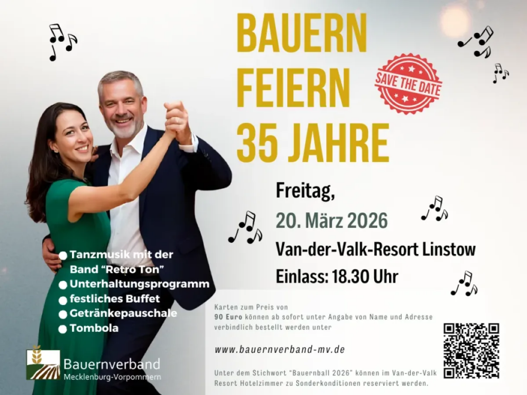 Der Bauernverband Mecklenburg-Vorpommern feiert am 20.03.2026 sein 35-jähriges Bestehen und lädt herzlich zum gemeinsamen Feiern beim Bauernball ein. Es erwartet Sie: Tanzmusik mit der Band „Retro Ton“, Unterhaltungsprogramm, Festliches Buffet, Getränkepauschale, Tombola