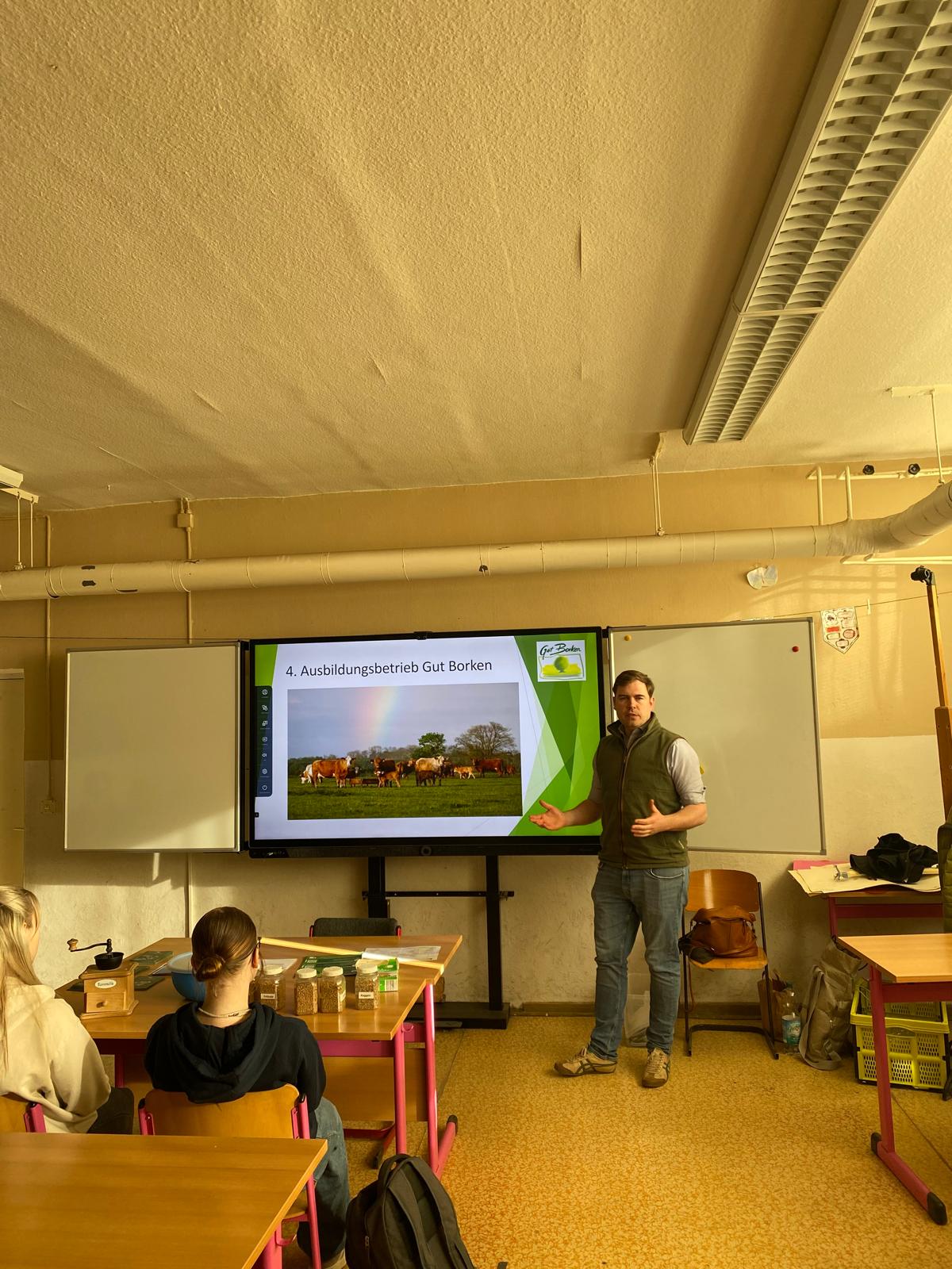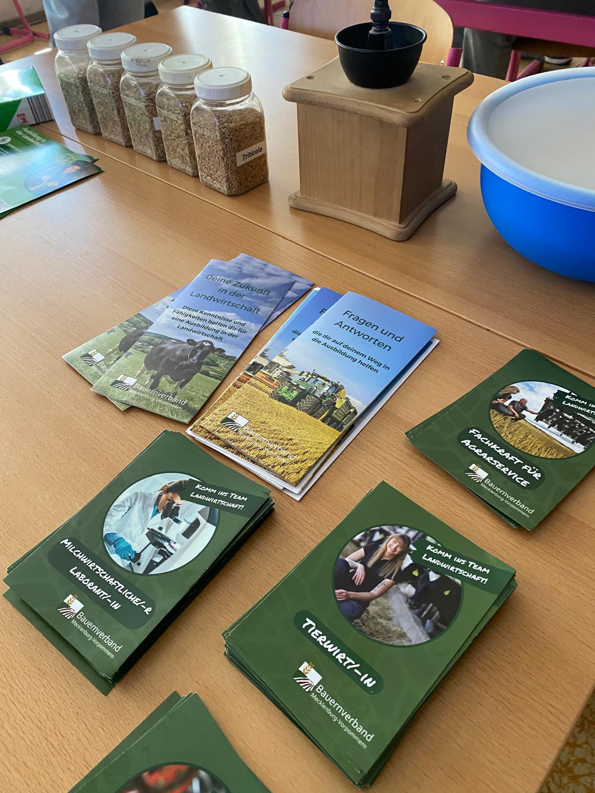 Am Freitag, den 13.03.2026, waren wir gemeinsam mit zwei Betrieben und der Arbeitsagentur zur Berufsberatung in der Regionalen Schule Löcknitz. Vier Klassen aus der 8. und 9. Jahrgangsstufe konnten wir am Vormittag die Grünen Berufe vorstellen, Neugierde wecken und Fragen beantworten. In jeweils zwei Räumen aufgeteilt haben wir die Schülerinnen und Schüler in einem interaktiven Format für die Landwirtschaft begeistert. Ludwig Jürgens, Landwirt aus Polzow, hat seinen Werdegang und Ausbildung vorgestellt sowie den Schülerinnen und Schülern am Landwirtschaftssimulator einen ersten Eindruck von der Arbeit in der Landwirtschaft gezeigt, so dass sie sich auch selbst ausprobieren konnten. Georg von Grawert, Geschäftsführer des Betriebs Gut Borken, hat den Klassen den Betrieb sowie die Ausbildungsmöglichkeiten präsentiert und für die Landwirtschaft grundsätzlich sensibilisiert. In kleinen interaktiven Gruppen, wie einem Quiz, Mehl mahlen und am Melkeuter konnten wir mit den jungen Menschen ins Gespräch kommen und Grundlagen zur Landwirtschaft vermitteln. Einige Schüler hatten bereits ein Praktikum bei regionalen Betrieben absolviert und waren fest entschlossen eine Ausbildung in der Landwirtschaft zu machen, was uns natürlich sehr freut!