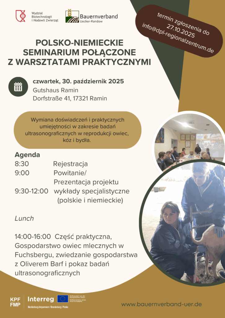 Am 30. Oktober laden wir gemeinsam mit der Uni Stettin zur ersten Vorstellungsrunde und zum Erfahrungsaustausch im Rahmen des Interreg-Projekts „Grenzüberschreitende Zusammenarbeit und Erfahrungsaustausch auf dem Gebiet der Ultraschalluntersuchungen und deren Anwendung in der Schaf- und Ziegenhaltung mit Praxisbeispielen auf Ökobetrieben im deutsch-polnischen Grenzgebiet“ nach Ramin ein.