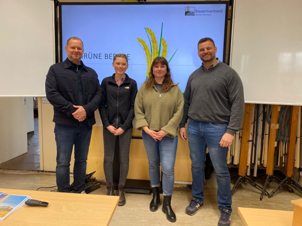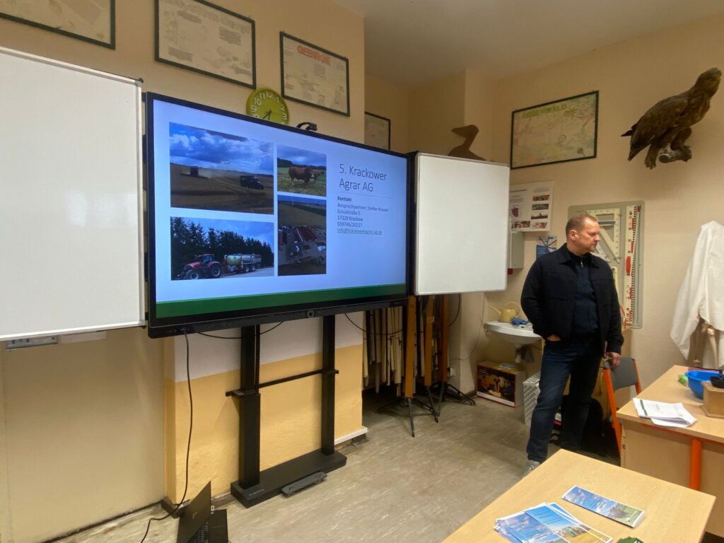 Am 14.04. fand an der Regionalschule Penkun eine Berufsorientierungsveranstaltung zum Thema „Grüne Berufe“ statt. In jeweils 45 Minuten konnten eine 9. und eine 8. Klasse spannende Einblicke in die Landwirtschaft gewinnen. Gemeinsam mit dem Betriebsleiter des Krackower Agrarunternehmens, einer Auszubildenden sowie Herrn Brüssow von der Arbeitsagentur haben wir insbesondere den Ausbildungsberuf Landwirt/in vorgestellt. Dabei ging es um die vielfältigen Aufgaben im Berufsalltag, den Ablauf der Ausbildung sowie die Voraussetzungen für diesen Beruf.