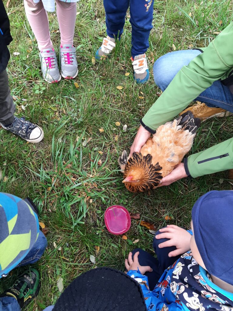 Ein besonderes Highlight war natürlich das Huhn. Die Kinder erfuhren, was Hühner fressen, wie ihr Körper aufgebaut ist und konnten selbst fühlen, ob es unter dem Flügel warm oder kalt ist. Mit viel Mut durften sie das Huhn sogar streicheln und auf den Arm nehmen. Am Ende des Tages fuhren alle Kinder mit vielen neuen Eindrücken, Erlebnissen und Wissen rund um das Leben auf dem Bauernhof nach Hause.