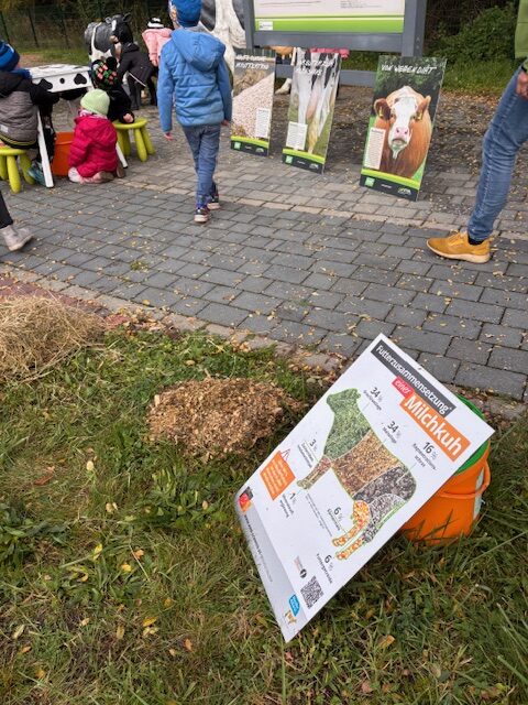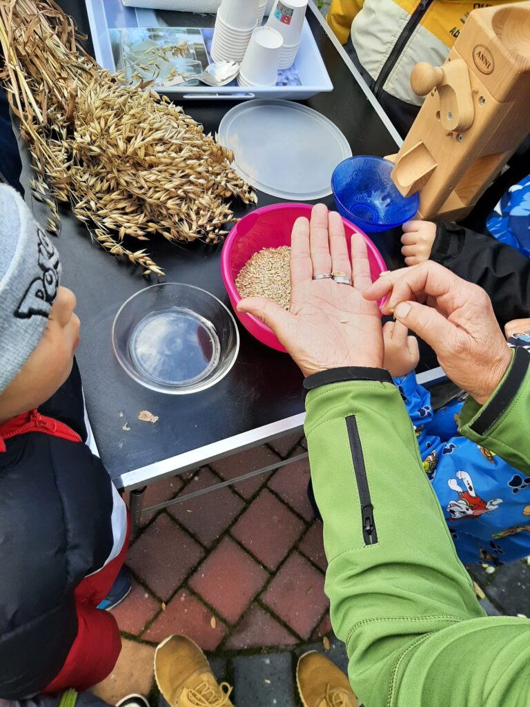Große Begeisterung herrschte auch beim „Melken“ am Melkeuter, hier wurde besprochen, woher die Milch kommt und wie viel eine Kuh eigentlich säuft. Anschließend wurden Haferflocken gequetscht und gemeinsam mit Joghurt probiert.