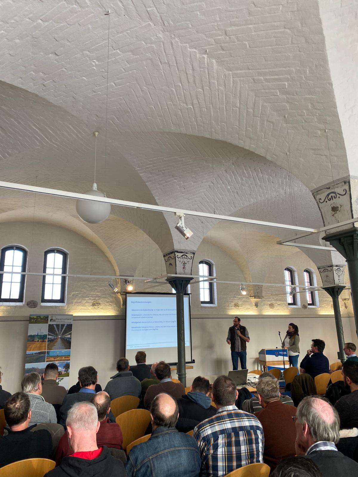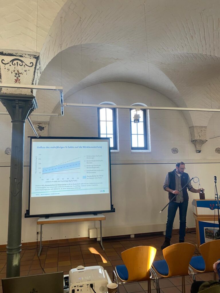 Anschließend stellten Michael Dau und Katharina Riebe (LFA) die Ergebnisse aus Stickwasseruntersuchungen mit einer Saugkerzenanlage vor. Die Anlage war den Teilnehmenden bereits von der Feldbesichtigung im Frühjahr 2025 bekannt. Der Vortrag führte zu lebhaften Diskussionen, u.a. wie es in der ökologischen Bewirtschaftung aussieht und wie dort die Ergebnisse sind. Die zahlreichen Rückfragen spiegelten ein großes Interesse an diesem Thema wider.