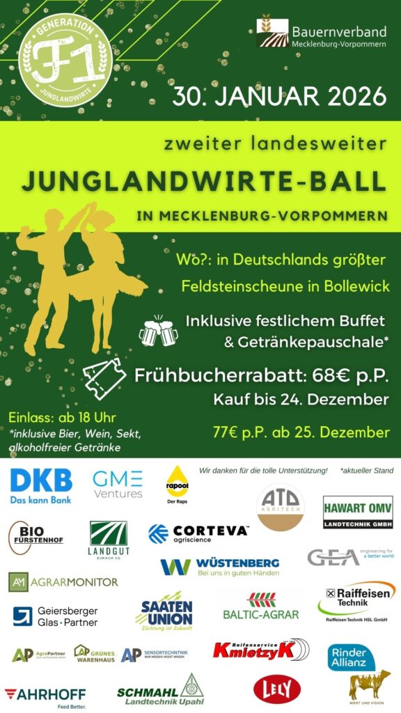 *Übernachten könnt ihr direkt vor Ort im Hotel „Scheunen Domizil Bollewick“. Dort könnt ihr euch unter dem Stichwort „Junglandwirte-Ball“ per E-Mail oder telefonisch eure Zimmer mit F1-Sonderkondition buchen. Telefon: 039931 – 545092; E-Mail: info@scheunen-domizil.de