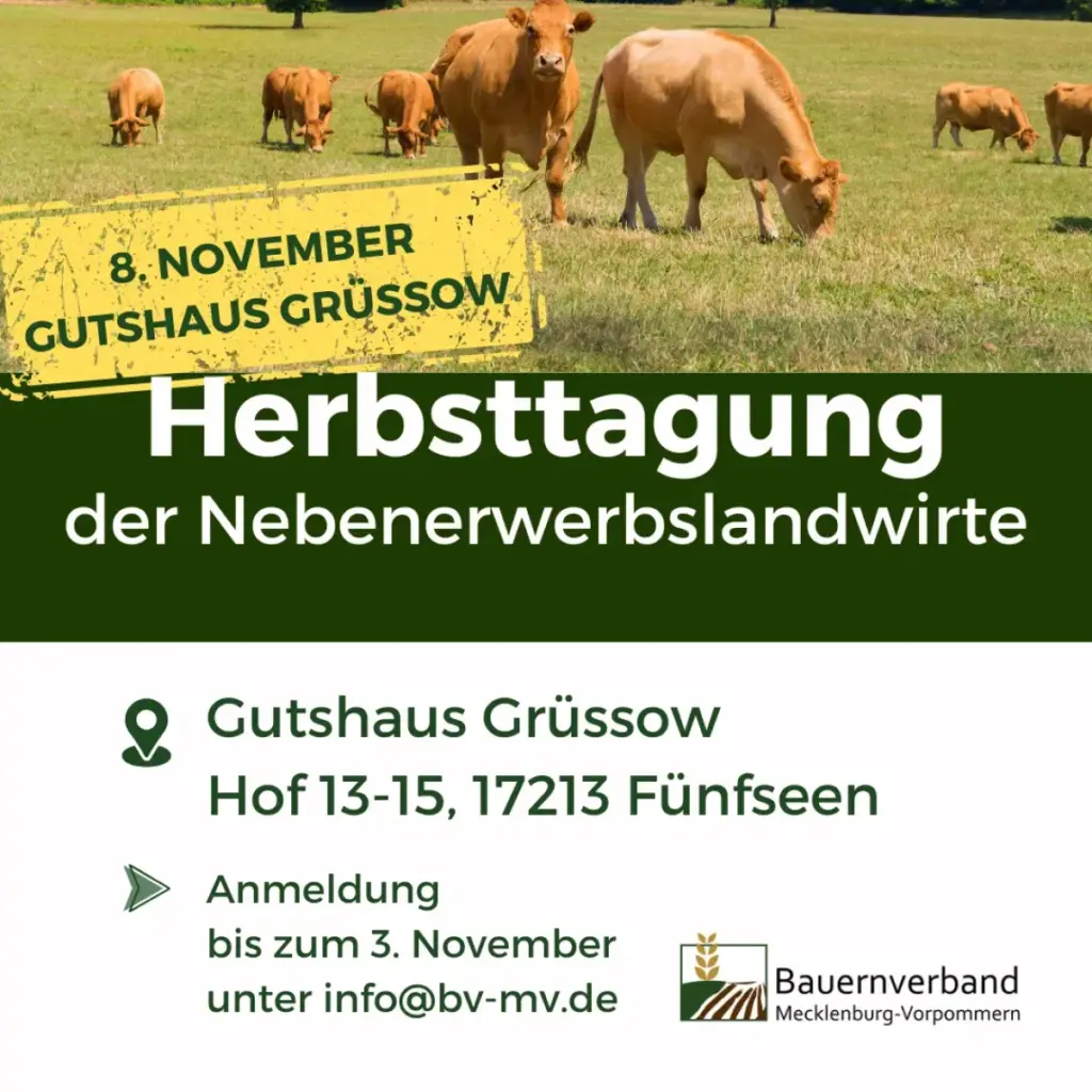 Der Bauernverband MV lädt alle Landwirtinnen und Landwirte im Nebenerwerb, unabhängig von einer Verbandsmitgliedschaft, herzlich zur Herbsttagung der Nebenerwerbslandwirte ein. Auch Interessierte sind willkommen.